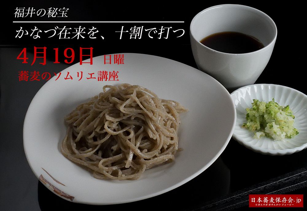 風味に優れ、粘りが強く、細切りにしても腰がしっかりしていて、十割そばに打たれるために存在するような「かなづ在来」を、4月19日の蕎麦のソムリエ講座では、皆さんに打っていただきます。